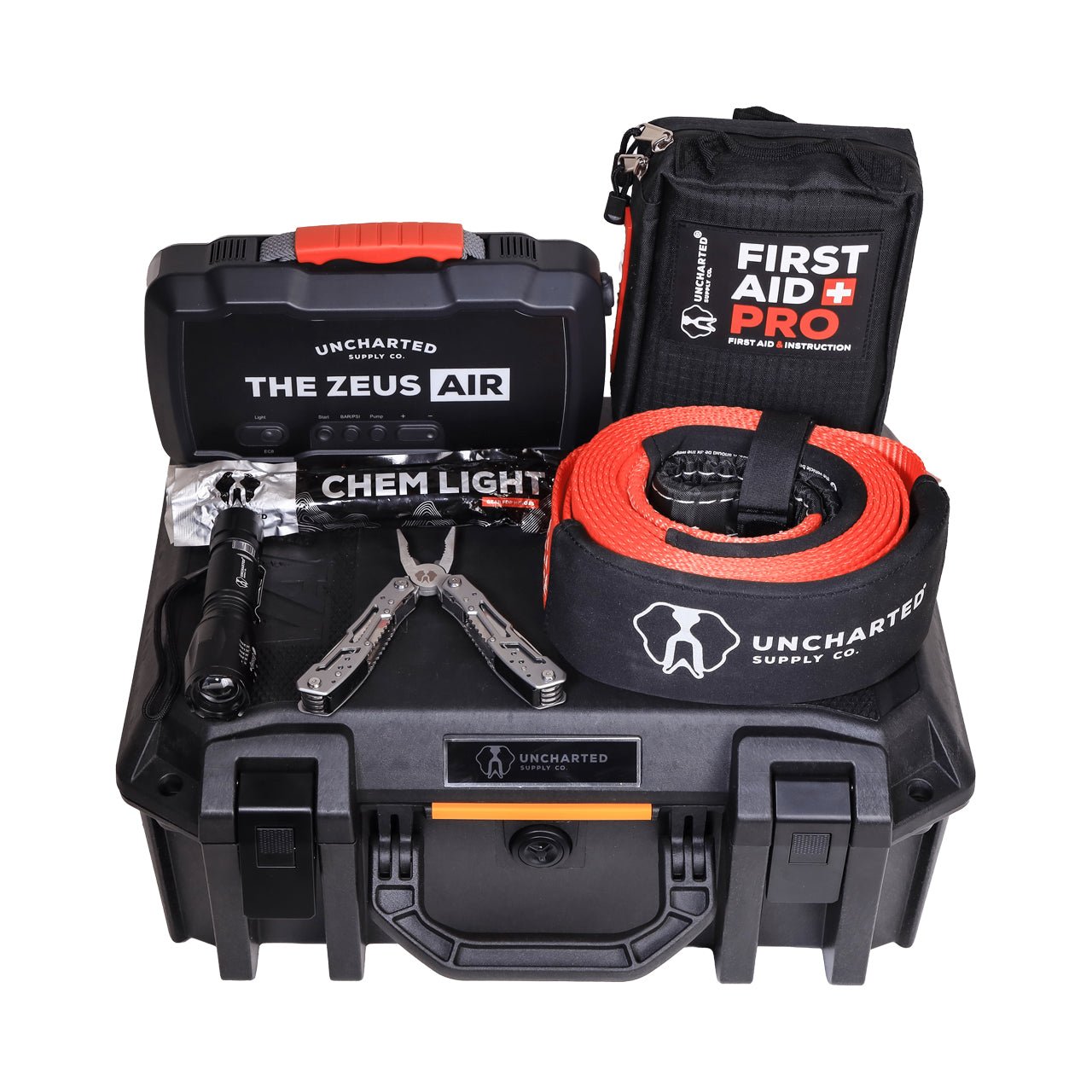 Asegúrate de mantenerte seguro mientras conduces con este set de Uncharted. Incluye la Unidad Aérea Zeus, que puede arrancar motores, inflar neumáticos y cargar dispositivos, un botiquín de primeros auxilios lleno de suministros médicos de emergencia y The Extractor, una correa de remolque fija que soporta hasta 17,500 libras. También se incluye una potente herramienta múltiple, una linterna táctica resistente al agua y luces químicas que sirven como iluminación de respaldo. Todo está empacado en espuma cortada a medida dentro de un estuche Pelican de marca personalizada, lo que facilita guardarlo en su baúl o área de carga.