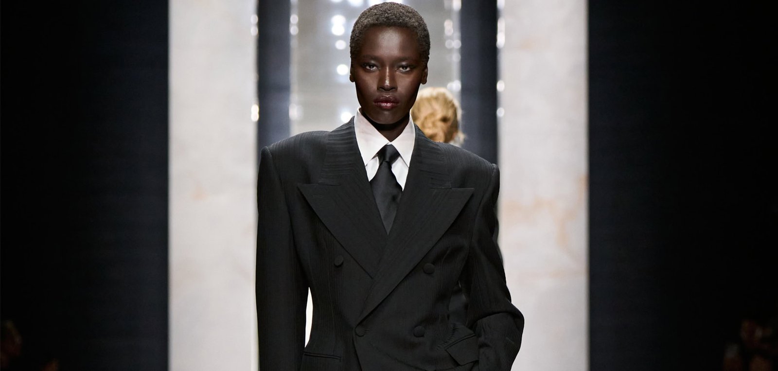 Su espectáculo celebró a todos aquellos que son inconfundibles. D&G-ismos, honrando su gran herencia de maneras que se sienten frescas y modernas. Una vez que Madonna tomó el lugar de invitada en la primera fila, comenzó el espectáculo. Presentaba una variedad de estilos dramáticos que seguían la clásica línea de reloj de arena de la marca, pero cada uno estaba cortado de manera que la espalda reflejara el frente, una intrincada hazaña de corte artístico que también llamó la atención sobre la sensualidad de la nuca. Los modelos se detuvieron y giraron para mostrar el efecto completo de 360 grados. El mensaje era importante. Esta no es una marca que se duerme en los laureles, sino que aún logra avanzar activamente a través de piezas creativas e innovaciones, más de 40 años después. La paleta era mayoritariamente negra, lo mejor para centrarse en siluetas y fabricaciones intrincadas.