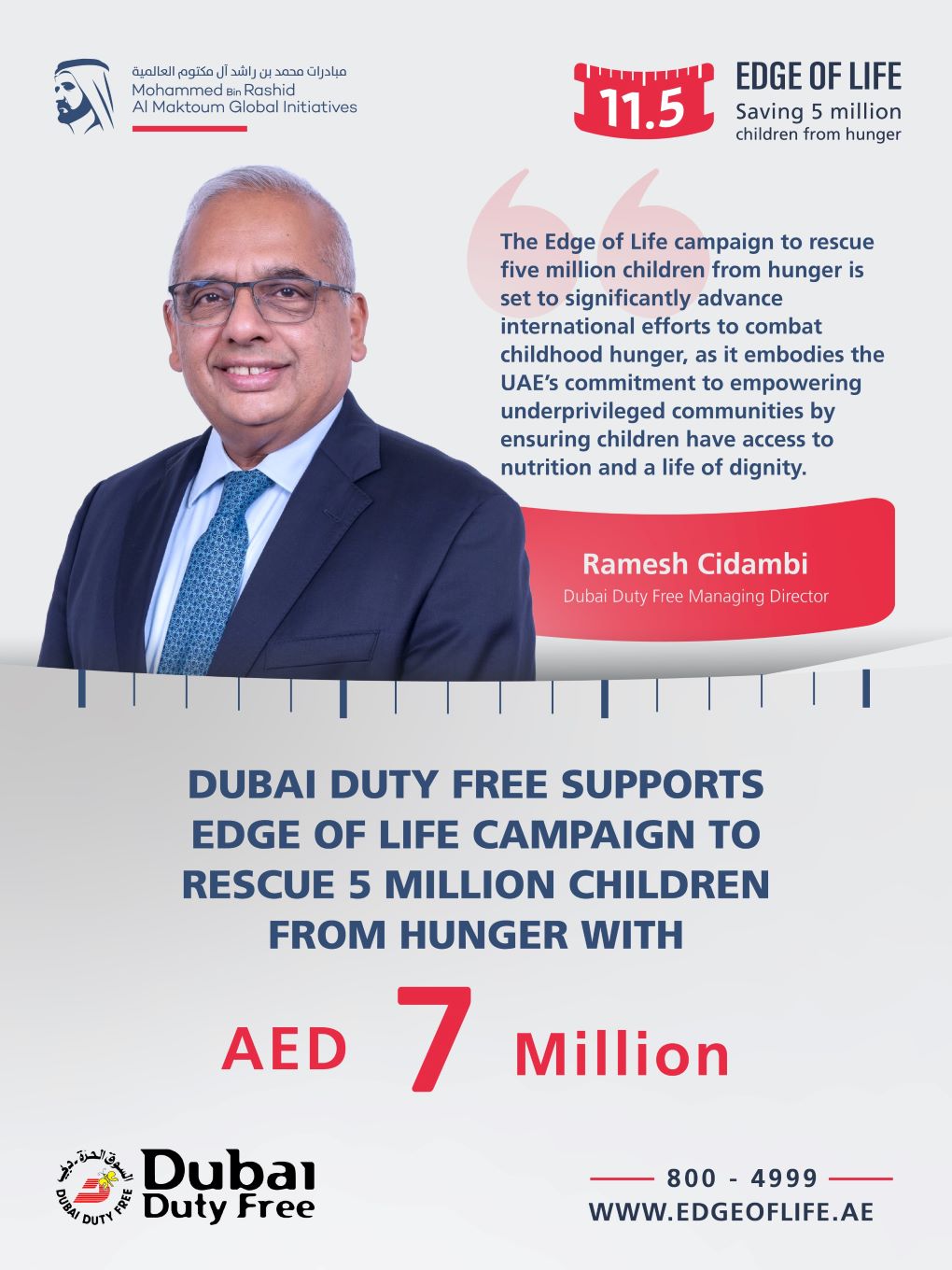 Emiratos Árabes Unidos. Dubai Duty Free ha donado 7 millones de dirhams (272.294 dólares estadounidenses) a la campaña Edge of Life, para apoyar los esfuerzos por salvar a 5 millones de niños del hambre.