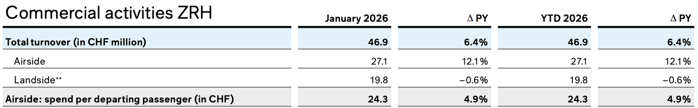 Suiza. Las ventas minoristas y de restauración en el aeropuerto de Zurich ascendieron a 46,9 millones de francos suizos (60,9 millones de dólares estadounidenses) en enero, un aumento interanual del +6,4%.