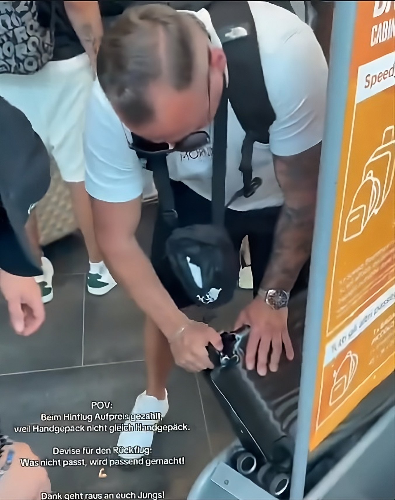 Un pasajero de una aerolínea de bajo coste fue sorprendido con un equipaje de mano ligeramente mayor de lo permitido. En lugar de verse obligado a inspeccionar la bolsa (y pagarla), decidió arrancar las ruedas de la bolsa para que encajara. Lo logró y redujo el tamaño de la bolsa, aunque le costaba hacerlo. Sácalo.
