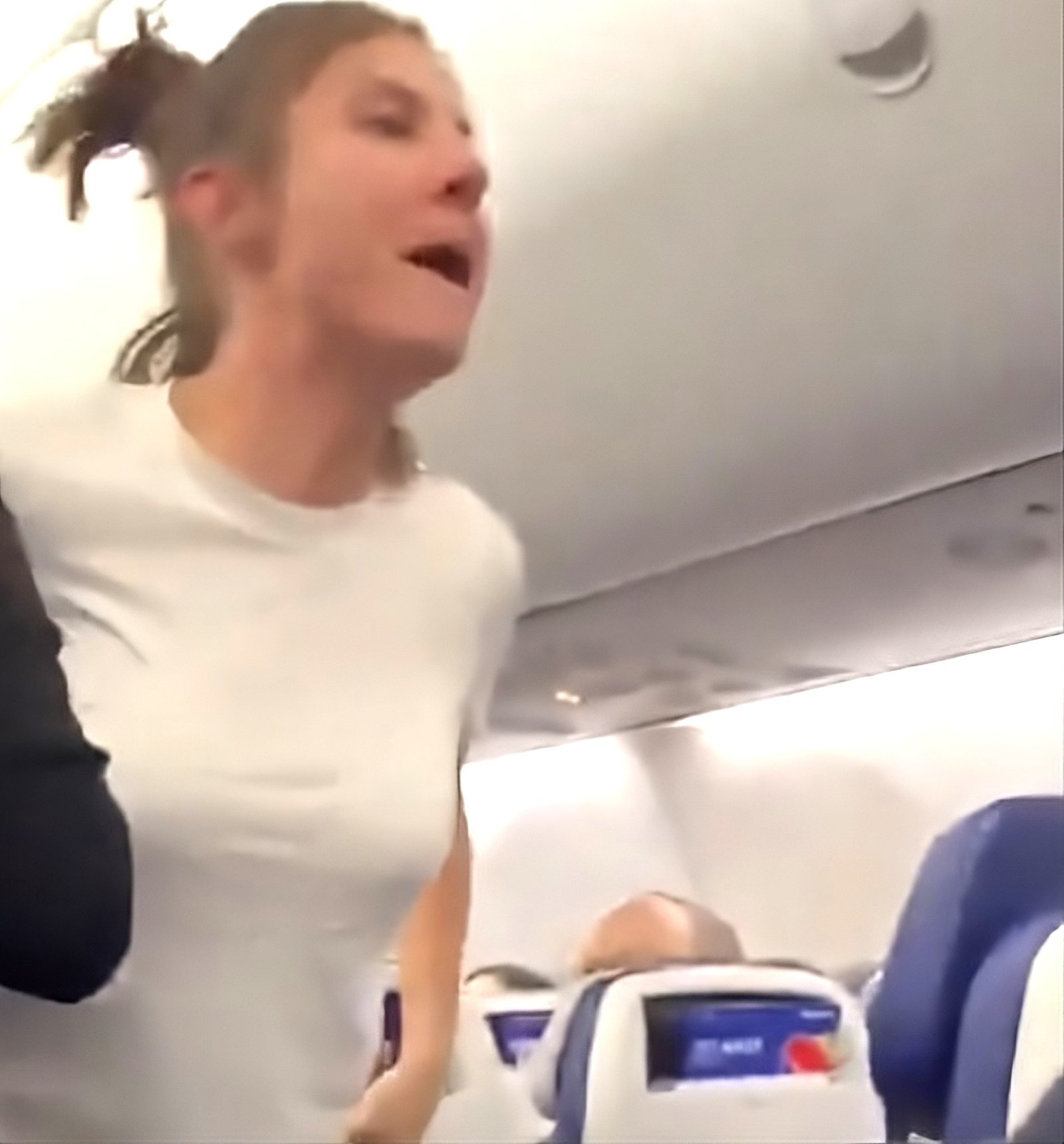 La han bautizado en línea como la “Dama de los pantalones deportivos blancos”. Ahora viene la segunda parte, que muestra a la misma mujer en un vuelo de Southwest. Está sentada en su asiento, se da vuelta, mira hacia la fila detrás de ella y le grita a otro pasajero. El idioma no es seguro para trabajar o trabajar desde casa. Ella grita cosas como: