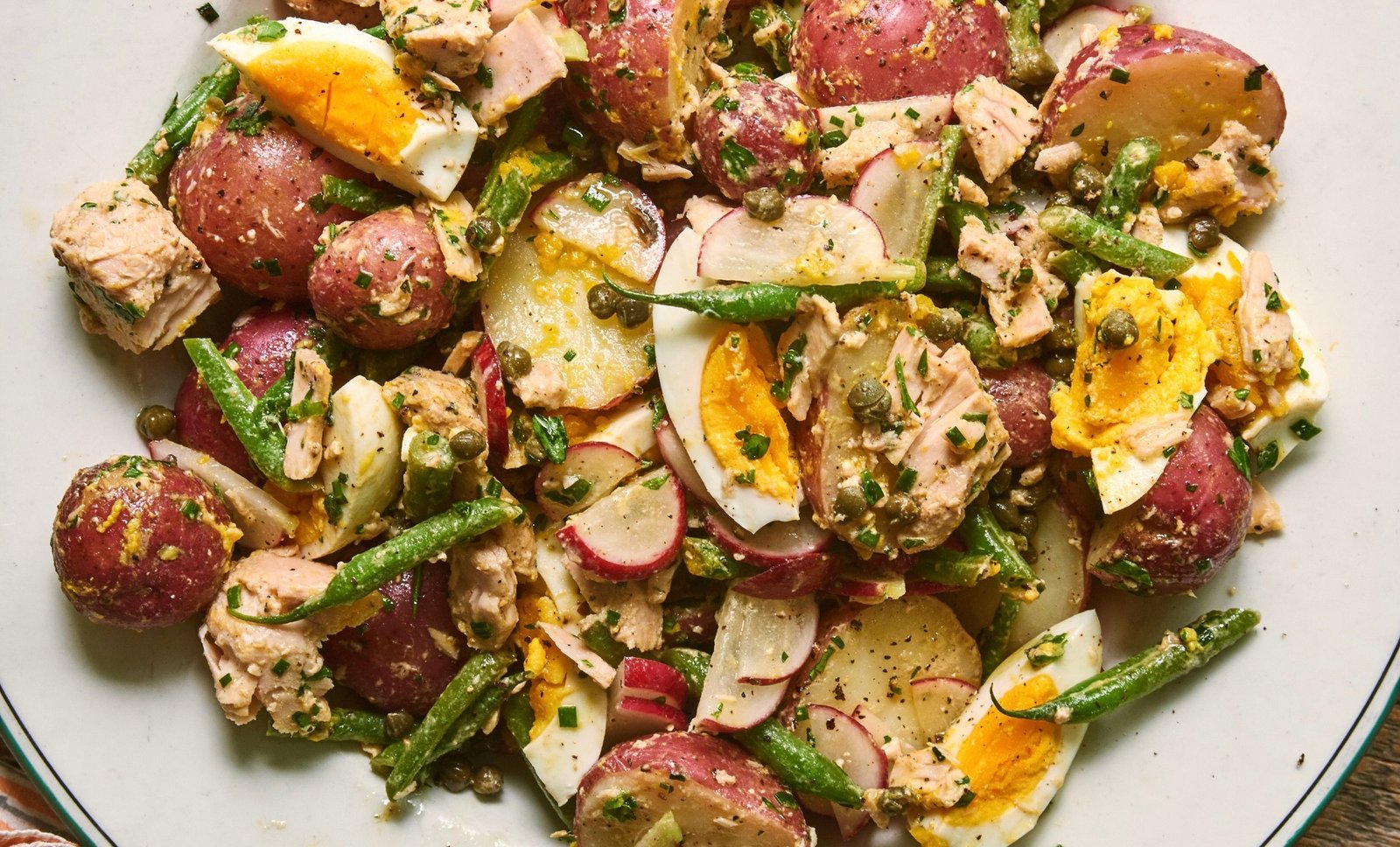 Hierva las judías verdes en agua con patatas durante 30 segundos a 1 minuto, el tiempo suficiente para que adquieran un color verde brillante. Escurrir y añadir a las patatas. Añade el atún y desmenuza el pescado en el bol, seguido de los rábanos y las cebolletas. Revuelva hasta que se combinen, luego agregue los huevos y el jugo de limón. (Nota: “Si va a preparar esto con aproximadamente un día de anticipación, reserve el jugo de limón y agréguelo justo antes de servir”, dice Melina. “De lo contrario, el color de las judías verdes se desvanecerá”). Mezcle nuevamente con cuidado. “A mí me gusta usar una espátula de silicona y mover desde el fondo del bol, juntando los ingredientes con una mano ligera hasta que quede la yema. Principalmente conectado.”