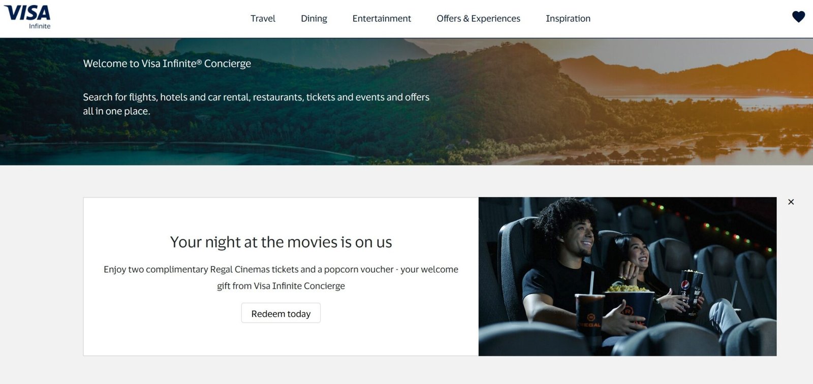 Credit Doctor ha revelado Un pequeño gran obsequio para los titulares de tarjetas Visa Infinite: puede registrarse en el conserje de Visa Infinite y obtener dos entradas gratuitas para Regal Movie y palomitas de maíz. Con una serie de tarjetas Visa Infinite populares en el mercado, esta es una oferta que muchos lectores pueden pedir a gritos, pero apuesto a que esta oferta se agotará más temprano que tarde.