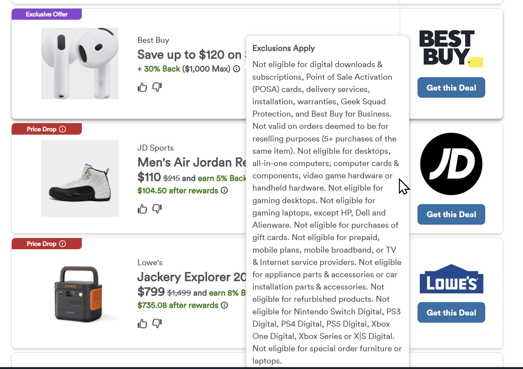 En la parte superior del sitio web y la aplicación de escritorio de Capital One Shopping, vi un gran cuadro explicativo que anunciaba un descuento del 15% en Best Buy. Sin embargo, mientras navegaba por las ofertas en la página de inicio y en la aplicación, encontré una oferta de devolución del 30%. La siguiente captura de pantalla muestra la tasa del 30% más excepciones.