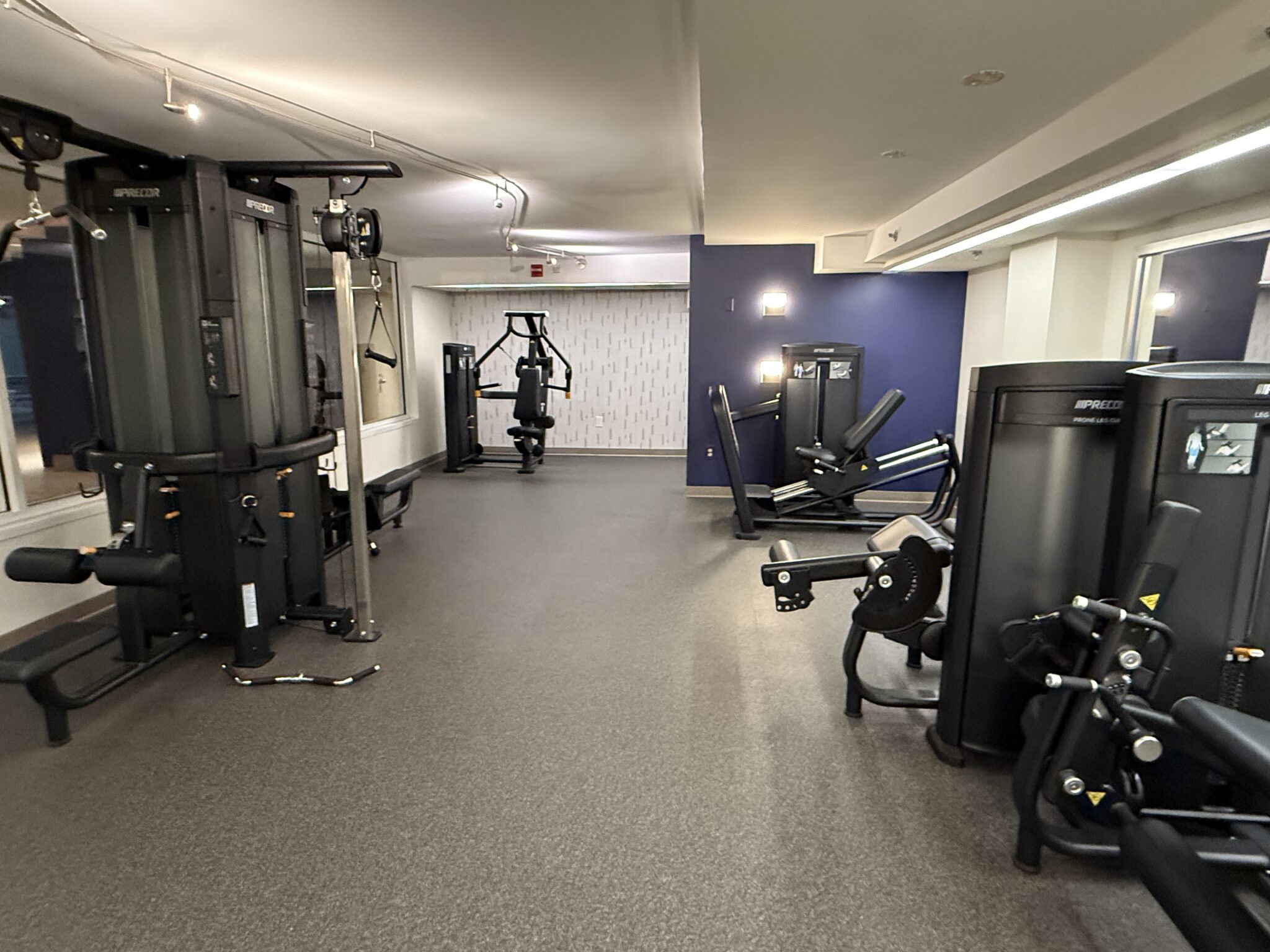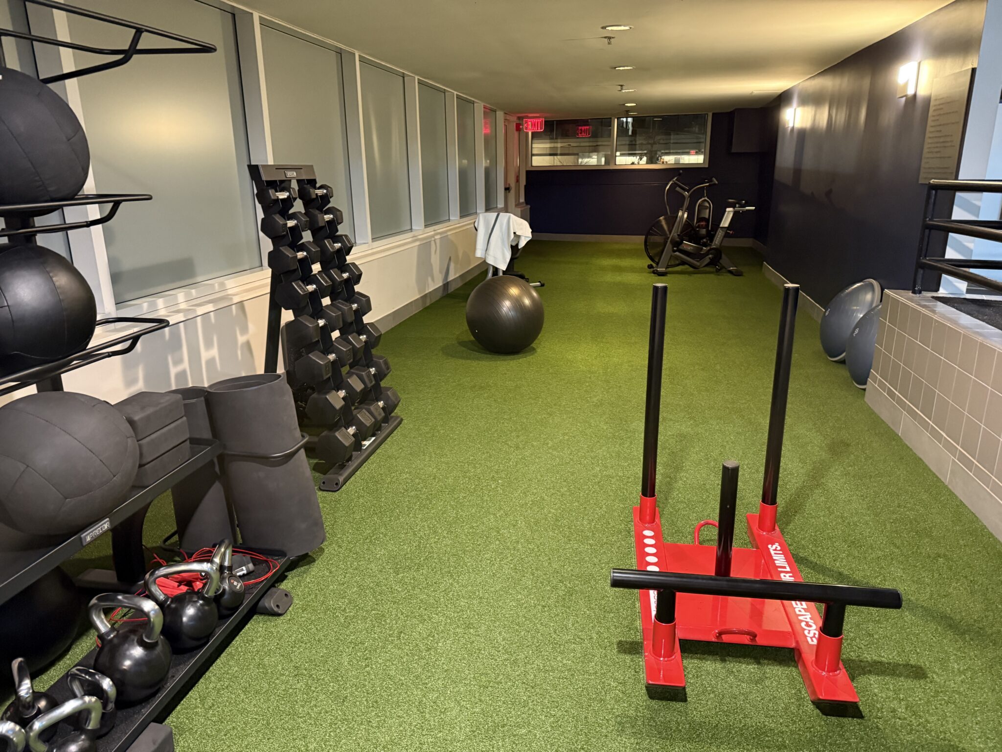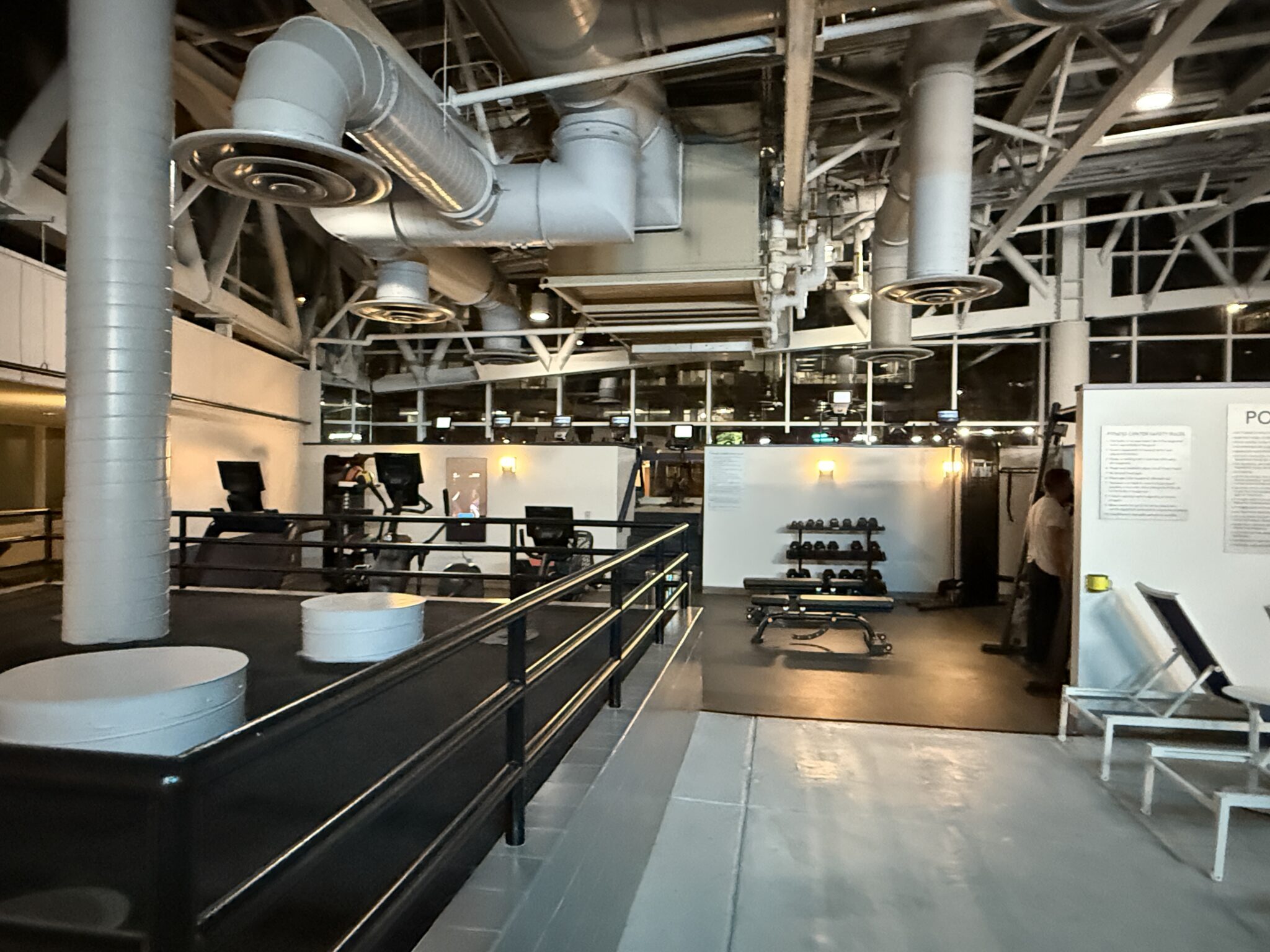 - sala de fitness: Un área compartida de gimnasio/piscina se encuentra al nivel de la calle en un gran solárium. La combinación de piscina y espacio para hacer ejercicio es un poco extraña y crea algunos rincones estrechos, pero hay suficiente equipo para hacer un entrenamiento razonable.