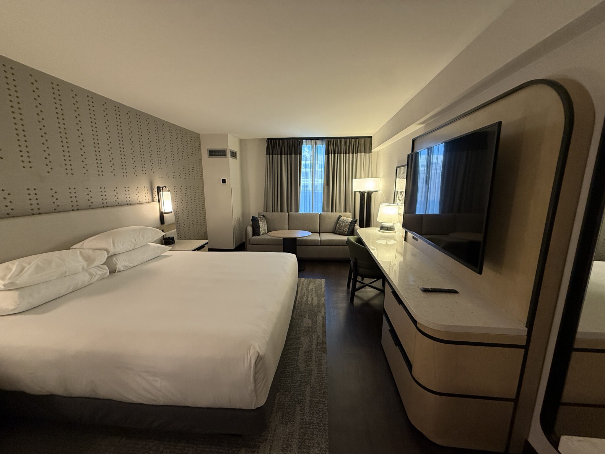 - habitación: Reservé una habitación estándar de 300 pies cuadrados “recién renovada” y no me ascendieron, aunque había muchos otros tipos de habitaciones disponibles. La habitación era pequeña y, aunque el interior era claramente nuevo, no parecía comercial, como si los muebles hubieran venido de Ikea y hubieran sido ensamblados en el lugar.