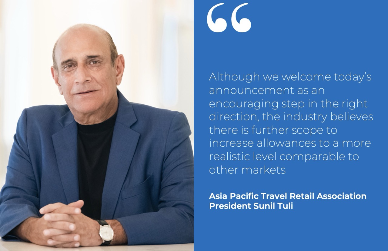 La Asociación de Comercio Minorista de Asia Pacífico (APTRA) acogió con satisfacción la noticia. “Durante varios años, los operadores libres de impuestos en la India han presentado argumentos ante el gobierno federal para que revise las asignaciones y APTRA los ha apoyado activamente en estos esfuerzos”, dijo Sunil Tuli, presidente de APTRA y director ejecutivo de King Power Group (Hong Kong).