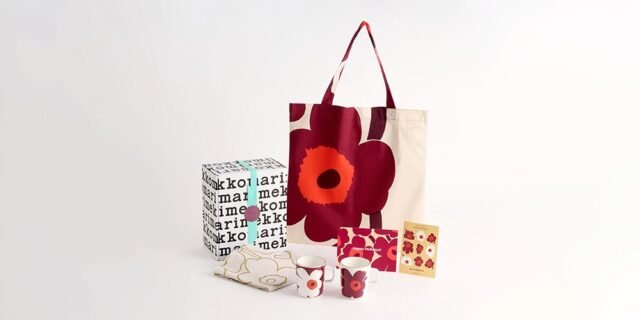 Disponible en dos opciones de color, rojo y azul, cada juego de regalo contiene cinco artículos, incluido un bolso de mano de edición limitada con el icónico patrón floral de Unikko. Además, el juego incluye un juego de tazas Unikko en un impresionante dorado metálico y un elegante color burdeos, un recorte de tela con un diseño de estampado único, una tarjeta con un mensaje navideño y una hoja de pegatinas.