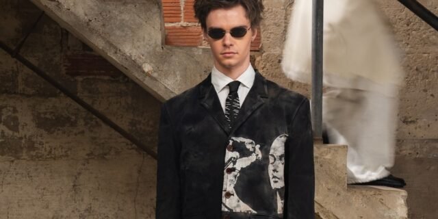 La colección también juega con elementos tradicionales de la moda masculina, como corbatas con estampado de cuadros y chaquetas de algodón de gran tamaño con patchwork que muestran una estética manchada y finamente estampada. Siluetas únicas, como pantalones anchos con detalles de dobladillo asimétrico y sudaderas con capucha terminadas con pesadas ataduras de cuerda, refuerzan el enfoque de la colección en la narración estructural en capas.