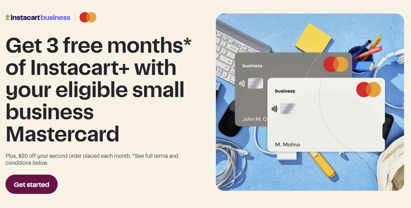 - Los nuevos titulares de tarjetas de crédito para pequeñas empresas Instacart+ US Mastercard® elegibles o los usuarios existentes de Instacart+ y los nuevos titulares de tarjetas de débito para pequeñas empresas Instacart+ US Mastercard® a partir del 1 de septiembre de 2025 pueden obtener $20 de descuento en su segundo pedido calificado de $10 o más, cada mes (“Oferta Mastercard de $20”).