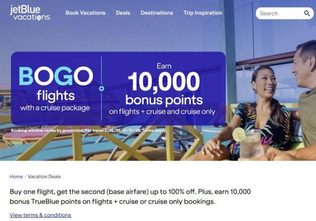 JetBlue ofrece actualmente una oferta BOGO (compre uno, obtenga otro gratis) en su tarifa aérea base cuando reserva un paquete de Vuelo + Crucero antes del 30/04/26. Si reserva antes del 19/02/26, puede acumularlo con 10,000 puntos TrueBlue adicionales (divididos entre los pasajeros de la reserva) para reservas de aerolínea + crucero o solo crucero. Apila más aún si tienes JetBlue Plus o Tarjeta de crédito comercial JetBlueya que ninguna de estas tarjetas ofrece un crédito de $100 cuando compras un paquete JetBlue Vacations.