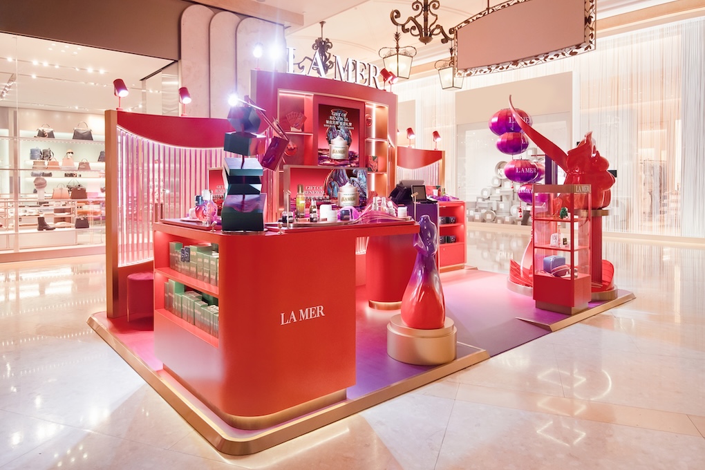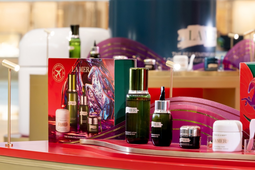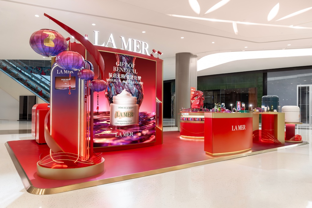 Entre ellos se encuentran paquetes rojos que contienen deseos de prosperidad, notas telefónicas personalizadas y un juego de tazas de té de cerámica. Las ventanas emergentes presentan una selección de las líneas estrella de La Mer, desde Crème de la Mer hasta The Rejuvenating Night Cream.