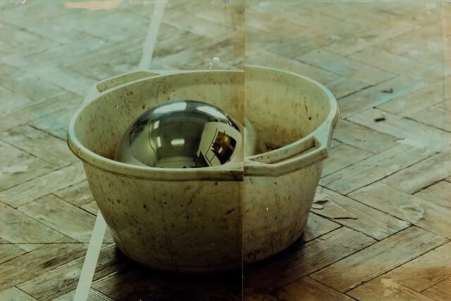 El primer espacio de la galería contiene solo una obra de arte, ubicada en un pequeño nicho preexistente en la sala victoriana, con los paneles de vidrio cubiertos con frascos personalizados que contienen una solución de yodo (el químico sensible a la luz utilizado en las primeras fotografías de daguerrotipo). A medida que la luz atraviesa los paneles, el espacio se transforma en un color naranja, cuya intensidad cambia a lo largo del día. El estado del líquido también cambia, ya que los cambios de temperatura crean condensación y la disipan, me dijo Faulkner, mientras que el yodo se volverá cada vez más pálido a medida que el sol lo decolore. mutabilidad y uso de materiales con una larga historia fotográfica; Las condiciones cuidadosamente ejecutadas y la aceptación de fuerzas externas van de la mano: sugiero que este primer acto es la introducción perfecta a lo que estamos a punto de encontrar. “Creo que es una buena introducción para el resto de la serie”, admite Faulkner.