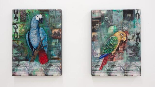en presosRivera presenta loros, garzas, pelícanos, palomas y otros en entornos arquitectónicos llenos de imágenes de activistas. Extractos de revistas, periódicos, carteles de protesta, imágenes de archivo e incluso textos recortados de una historia de Instagram cubren las paredes de cada celda, transformando el austero entorno de hormigón y acero en un espacio de posibilidades.