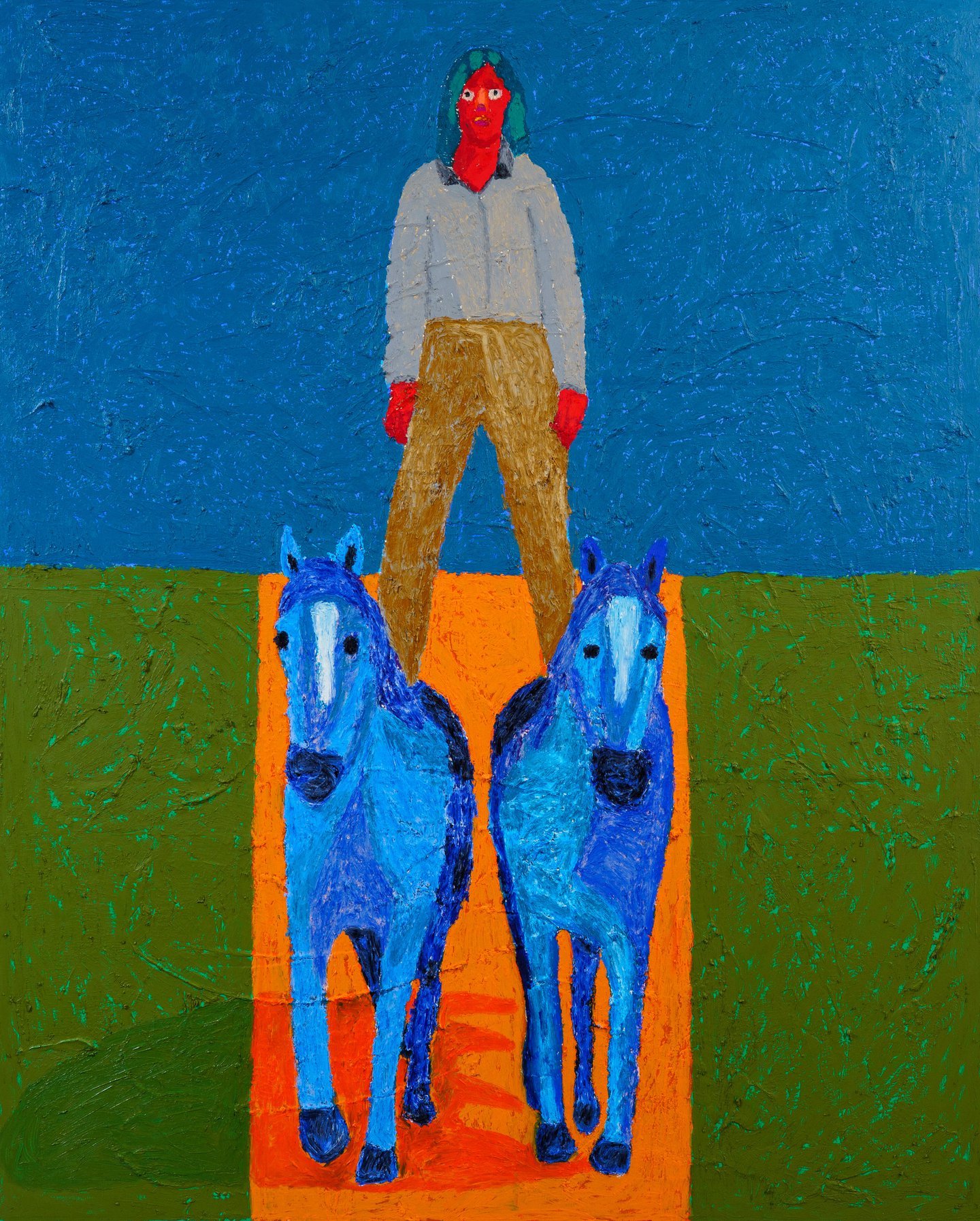 En algunas obras se puede ver el lienzo blanco debajo de los garabatos de pasta textural, en otras se pueden ver las gruesas bolas de pintura y las sombras capturadas debajo de ellas en las fotografías. Si bien la mayoría de los artistas estudian la teoría del color y se atienen a un libro de reglas, las pinturas de Diogo son atípicas, mezclan colores alegres, a veces hacen que las formas parezcan fotografías al revés o implementan polos opuestos para subvertir las expectativas de la pintura figurativa y de objetos. Funciona por la inocencia de la que habla Diogo, un candor metálico que pide ser abusado sin hacer daño.