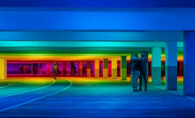 ¿Quién dijo que los aparcamientos son sólo para coches? Artista británico y amante del color. Liz West Transformó un piso de una estructura típica de concreto en un entorno de color inmersivo adecuado para patinar, bailar y disfrutar del brillo del arco iris.