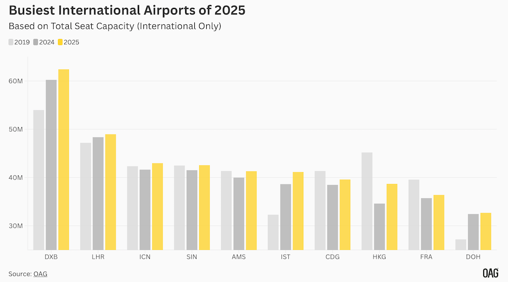 El Aeropuerto Internacional de Dubái vuelve a ser el aeropuerto internacional más transitado del mundo en 2025, con 62,4 millones de asientos internacionales, 13,5 millones más que el aeropuerto de Heathrow en Londres, que ocupa el segundo lugar.