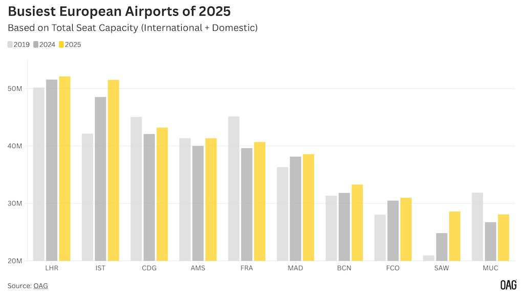 Estambul le sigue de cerca con 51,5 millones de asientos y continúa registrando el mayor crecimiento a largo plazo entre los principales aeropuertos de Europa, ahora un 22% más que en 2019.