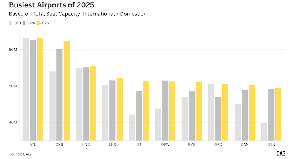 Sin embargo, el aeropuerto internacional de Dubai ocupa el segundo lugar. La OAG señaló que, con 62,4 millones de asientos, Dubai sigue siendo el segundo aeropuerto más transitado del mundo y, durante ciertos meses, incluso supera a Atlanta.