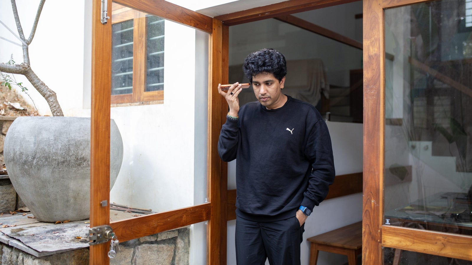 Akhil Vinayak escucha un mensaje de voz de un cliente en su casa de Thiruvananthapuram, India. Vinayak Kanavu Kadha Studio produce videos con tecnología de inteligencia artificial.