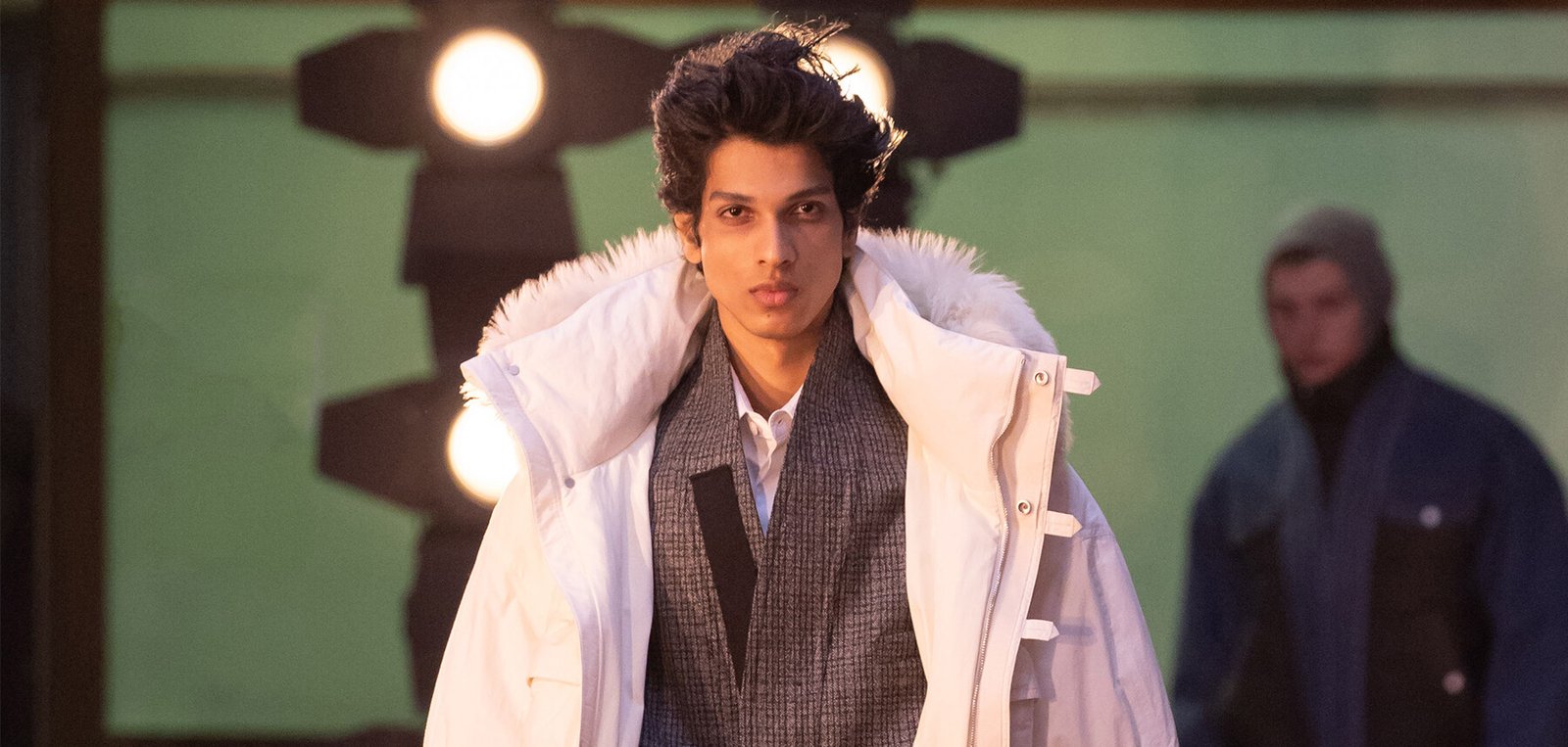 Las referencias militares a la ropa de trabajo se suavizaron con cuellos de pashmina, cierres estilo kimono y cuellos de nailon. Las chaquetas con estampado de piel trompe l’oeil agregaron profundidad mientras mantenían el enfoque en la calidez y la construcción. La paleta de colores (blanquecino, arena, verde arcilla, negro y destellos de azul Klein) mantuvo todo firme.