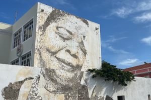 Este impresionante y emotivo retrato de la cantante más famosa de Cabo Verde, Cesaria Evora (1941-2011), cubre un lado del principal edificio cultural frente a la plaza central, Praça Dom Luís. El artista portugués Fels grabó la imagen en lugar de pintarla.