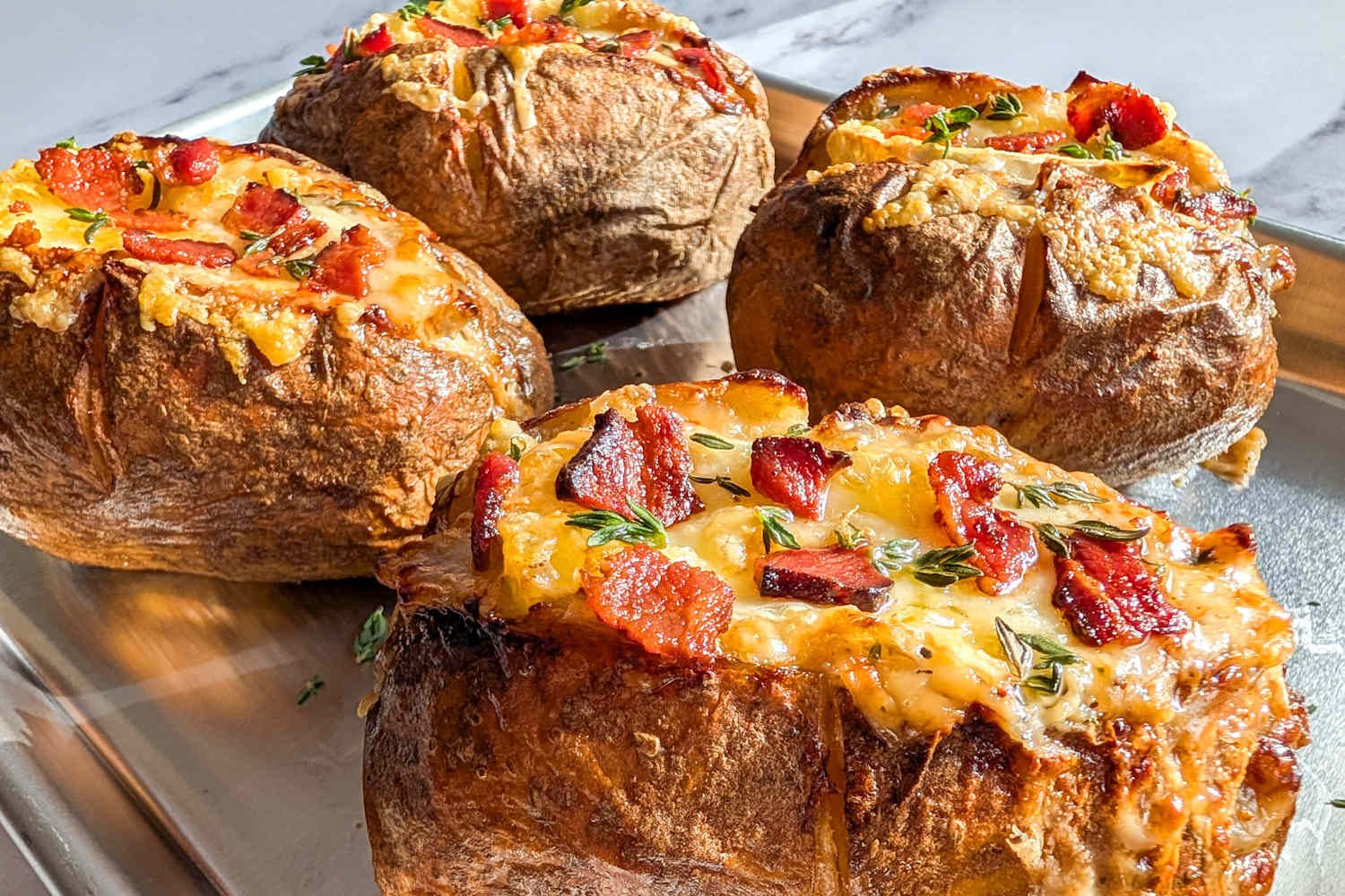 A veces quiero todos los sabores divertidos y reconfortantes de las tartiflettes clásicas sin comprometerme con una cazuela entera. Introduzca: estas patatas al horno tartiflette. Es todo lo que me encanta de un plato francés clásico, con tocino crujiente, salsa cremosa y queso derretido, pero metido en una papa al horno perfectamente crujiente y crujiente. Cada papa se convierte en su propia porción pequeña, cargada de un sabor rico y delicioso y mucho queso pegajoso.