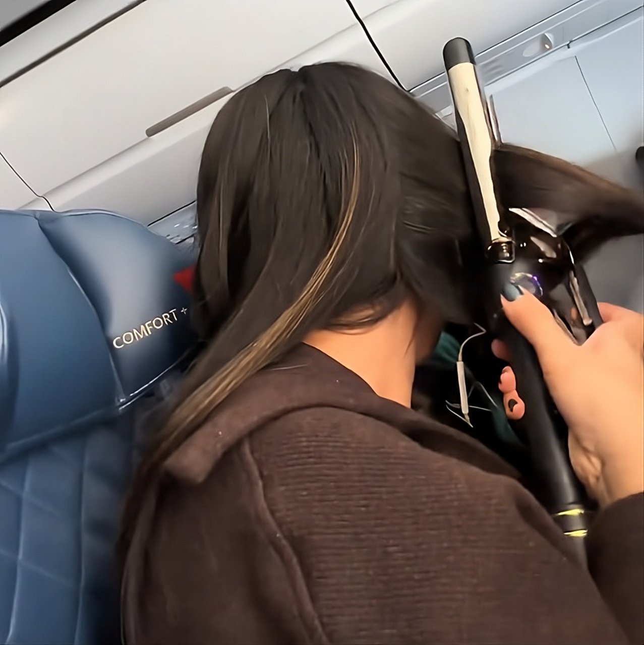 Delta Air Lines tiene tomas de corriente de CA en la mayoría de los asientos. Pero eso no significa que todos tus dispositivos tengan que estar encendidos. Un breve vídeo muestra a una mujer sentada en el modo económico Comfort+ con espacio adicional para las piernas y usando un rizador para rizar su cabello en el avión.