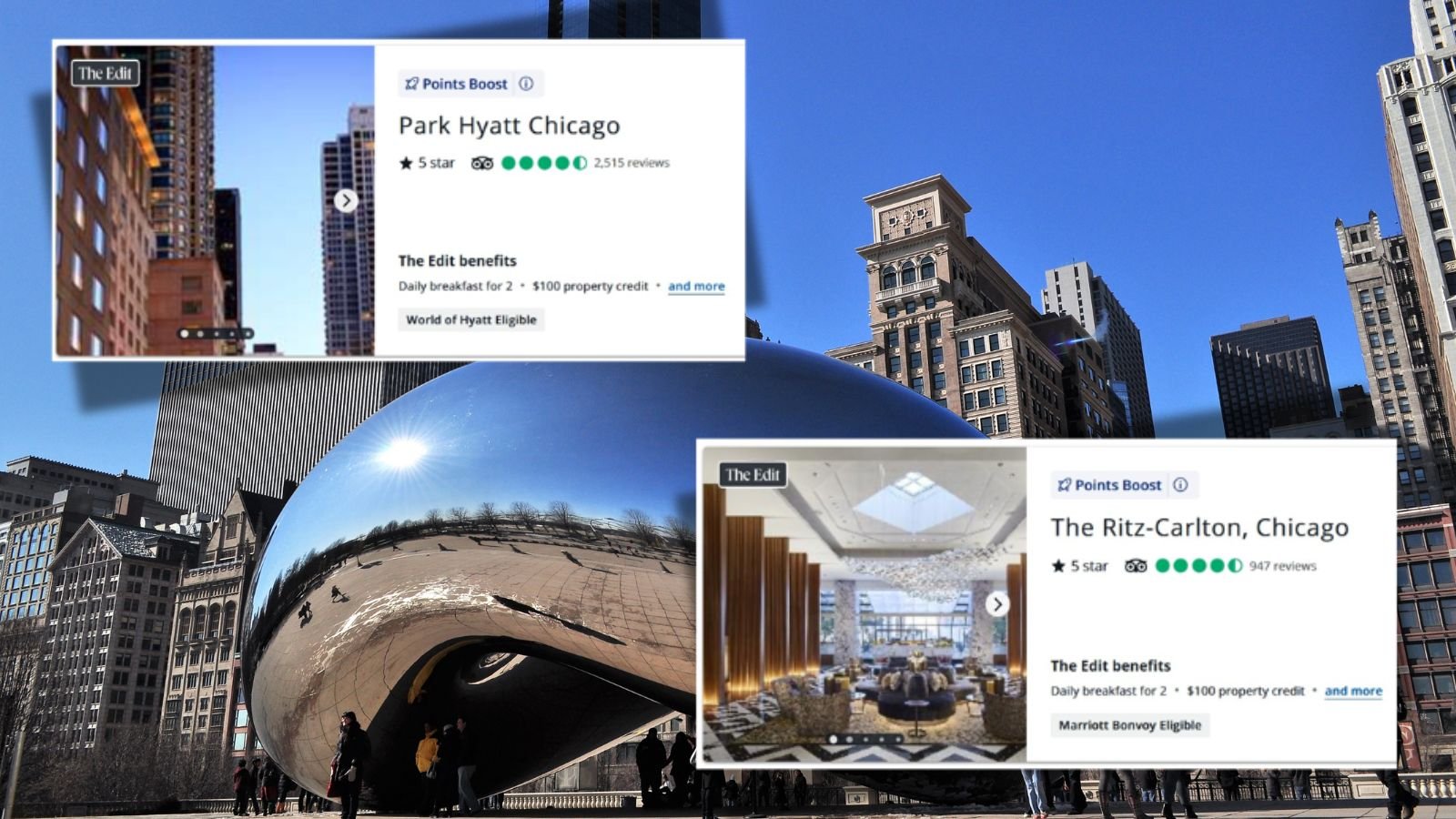 La modificación es mejor en lugares donde los precios de los hoteles son moderados. De lo contrario, normalmente será mejor que utilices puntos con programas de hoteles que tengan tarifas de premio fijas, como Hyatt. Chicago es una ciudad de precios moderados donde The Edit realmente brilla. Nueva York, en cambio, es muy cara. Eché un vistazo a los hoteles disponibles en ambas ciudades para un fin de semana aleatorio el próximo año (del 15 al 17 de mayo) y registré las tarifas de puntos por 2 noches encontradas en Hyatt y The Edit. En Nueva York vi, como era de esperar, que Hyatt ofrecía mejores tarifas. Sin embargo, la enmienda nos brinda muchos hoteles adicionales para elegir, a precios similares. En Chicago, descubrí que reservar hoteles de lujo a través de The Edit puede ser una excelente opción.