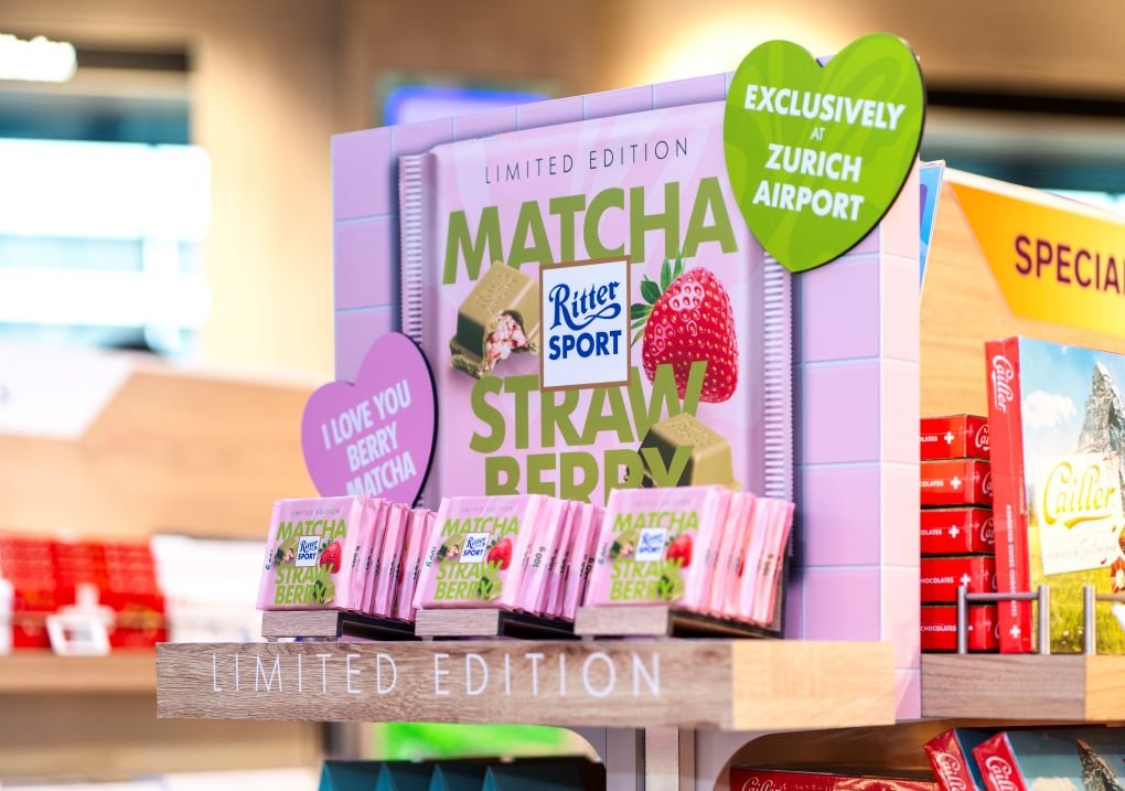 Suiza. El especialista alemán en chocolate Ritter Sport se ha asociado con Avolta para lanzar un exclusivo disco Matcha Strawberry para viajar en el aeropuerto de Zurich.