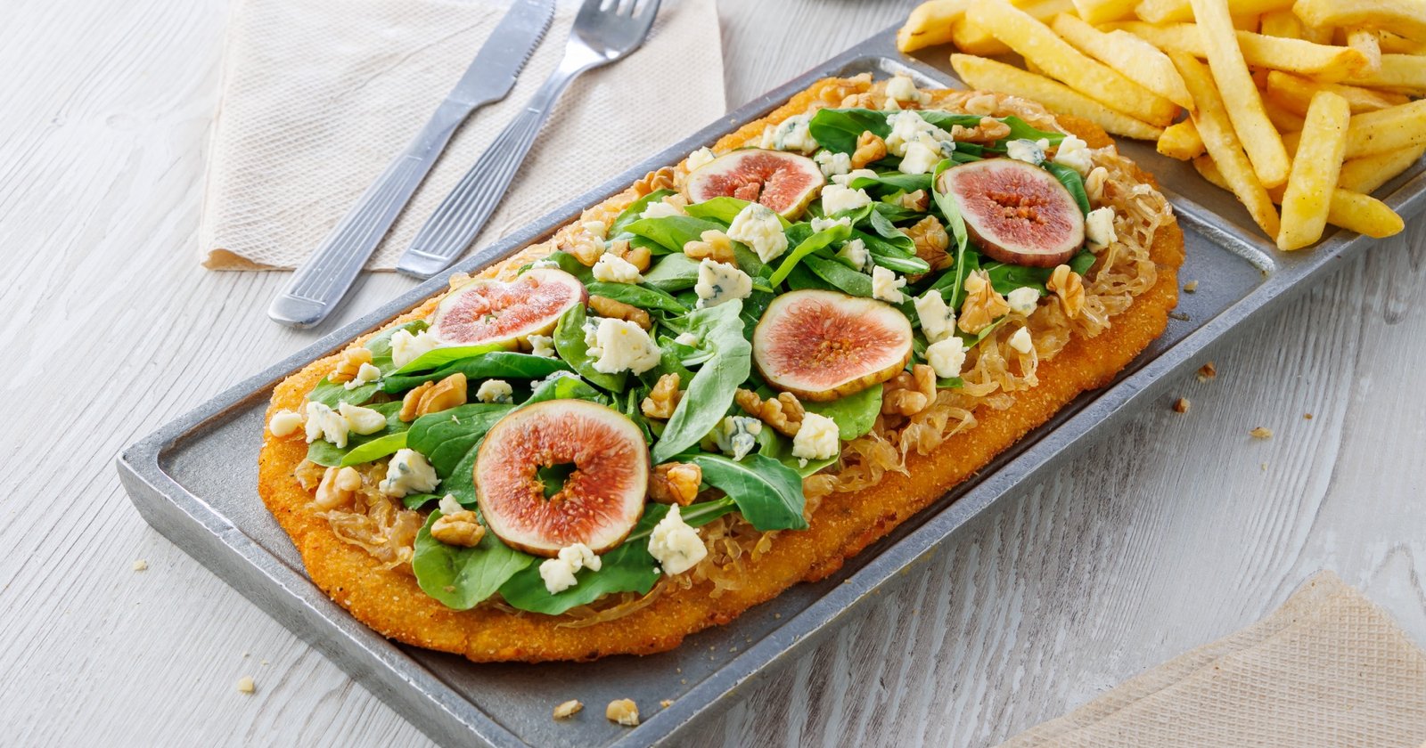 Milanesa con Gorgonzola, con cebolla caramelizada, nueces trituradas, rodajas de higos frescos y vinagreta de miel. | Foto cortesía del Club de la Milanesa