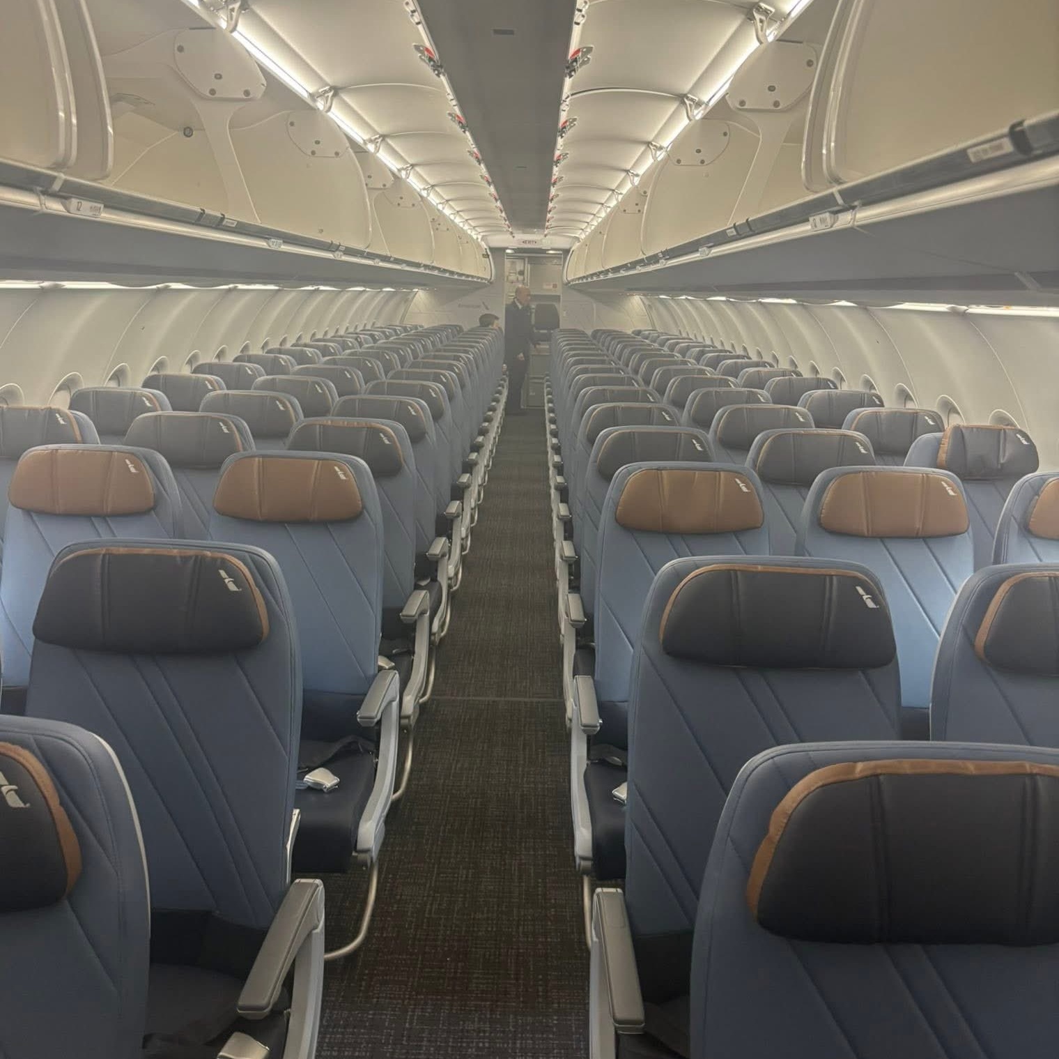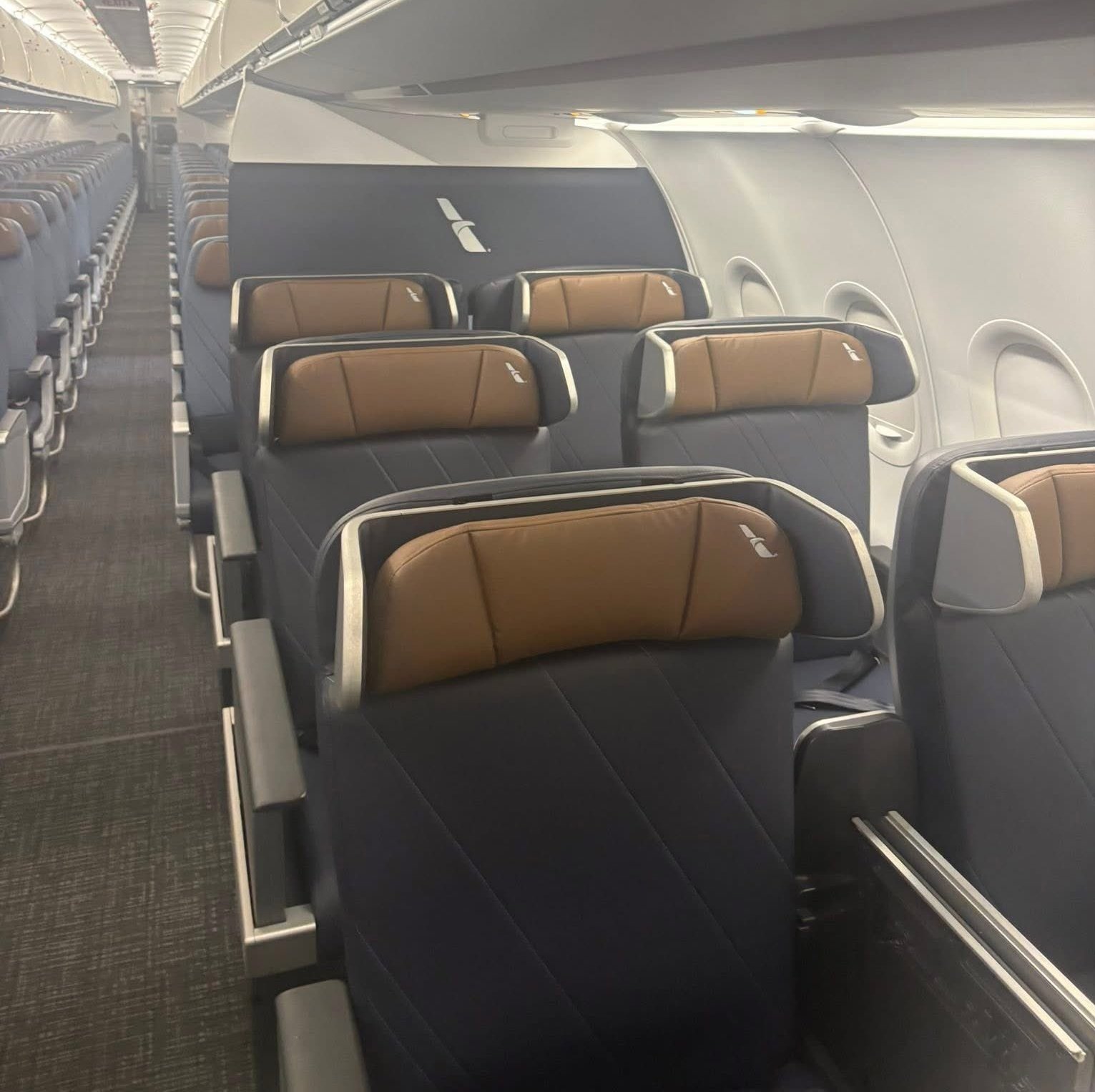 Nuestro primer vistazo al interior de la modernización del A319 de American Airlines. Tapicerías y acabados nuevos actualizados. Compartimentos superiores Airbus XL, 4 asientos adicionales en FC (12/120). Nuevas escenas de iluminación ambiental.