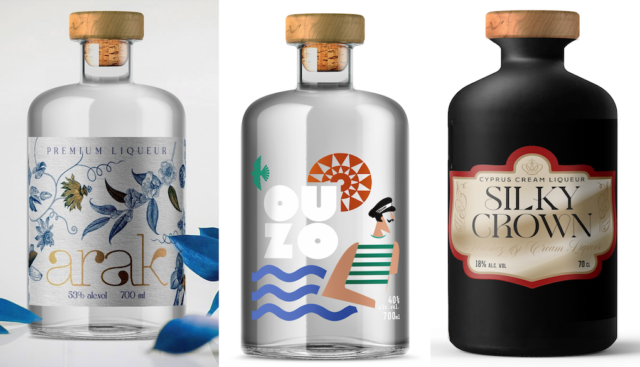 Tres nuevos lanzamientos atractivamente empaquetados en el Duty Free de Chipre: (de izquierda a derecha) Arak, Ouzo y Silky Crown Cream Liqueur
