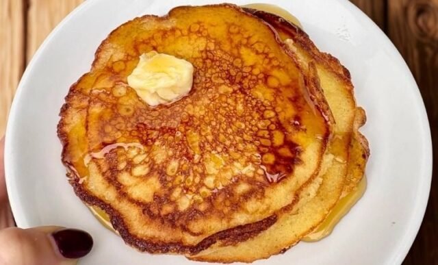 Sirve los panqueques con una cucharada de mantequilla y un generoso chorrito de jarabe de arce.