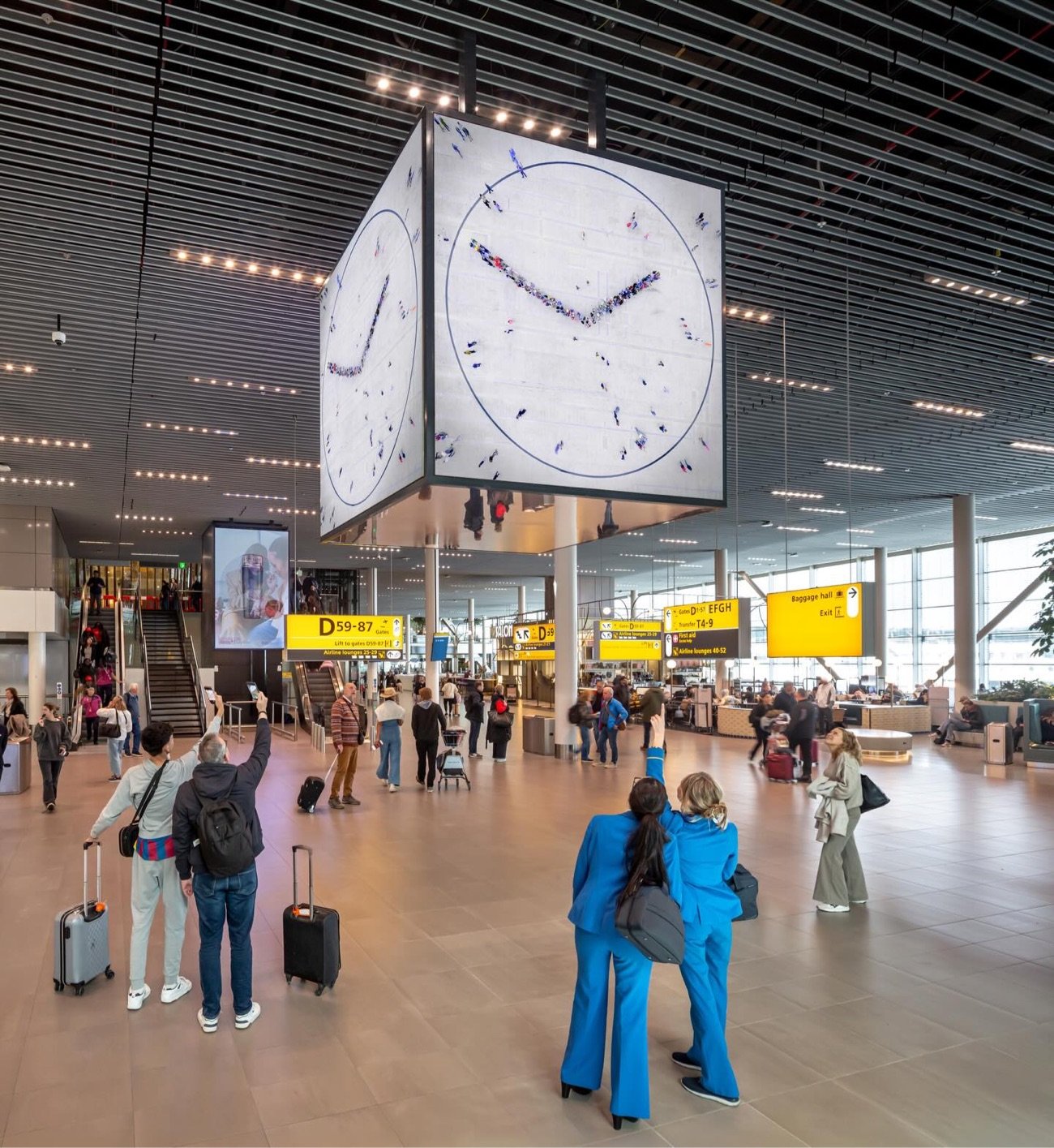 Como parte de su VERDADERO tiempo Serie creada por el artista Martin Bass. La hora del puebloVive en el aeropuerto de Schiphol en Amsterdam. Para crear el mecanismo de reloj, Bass reclutó a más de 1.000 voluntarios. Moviéndose como un reloj Más de 12 horas. Si miras con atención, puedes ver a un individuo vestido de naranja en el borde del círculo que actúa como segundero: