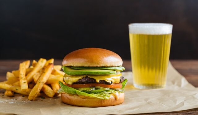 - Hamburguesa con queso y aguacate ($ 14,75): Carne de res a la parrilla con queso americano y cremosas rodajas de aguacate, complementada con tomates orgánicos, cebolla blanca, pepinillos y lechuga.