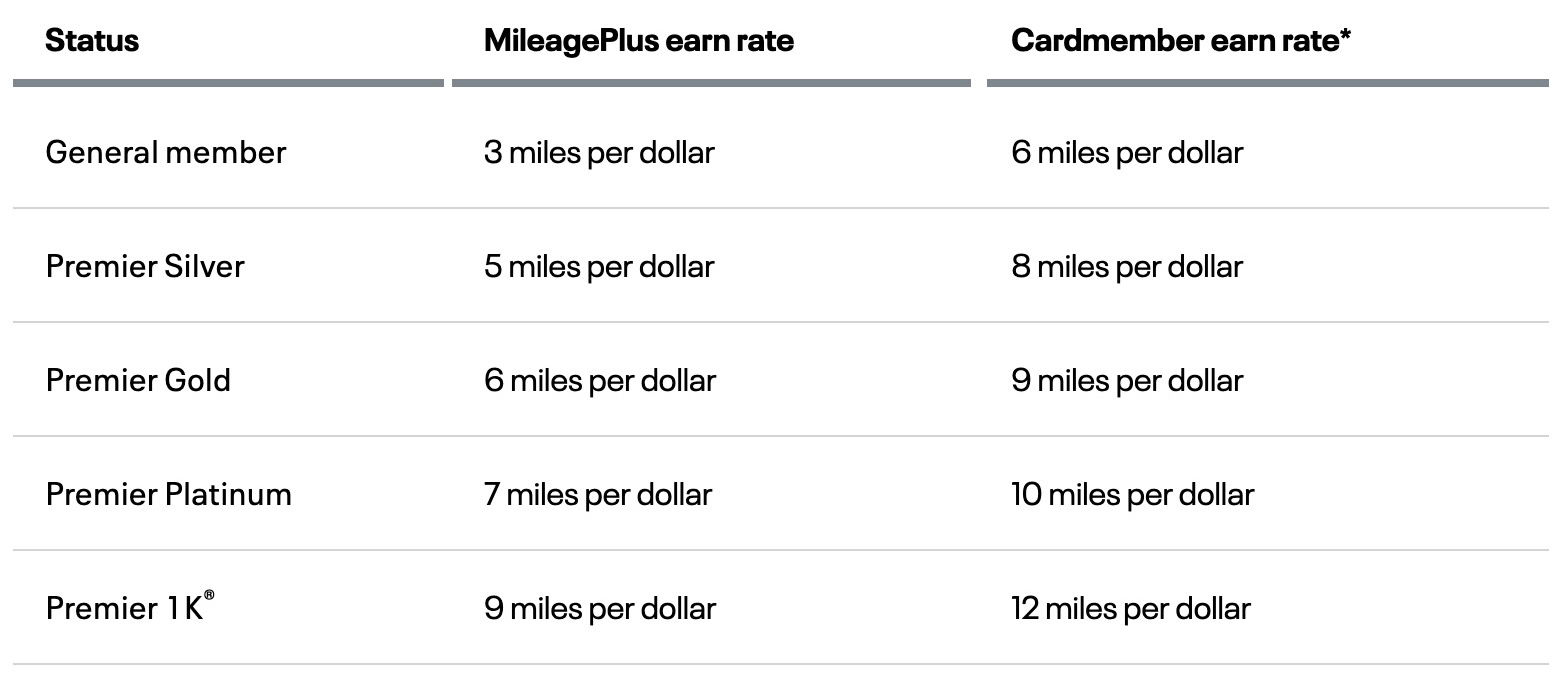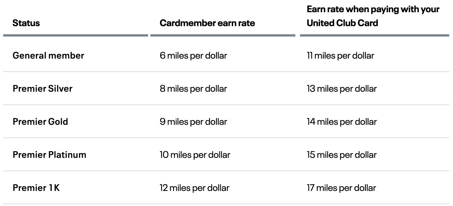 Por ejemplo, un miembro Premier 1K con una tarjeta de crédito de marca compartida ganará 12 millas por dólar gastado cuando pague con otra tarjeta, mientras que si paga con una tarjeta United Club, ganará 17 millas por dólar gastado (ya que la tarjeta ofrece 5 millas de bonificación).