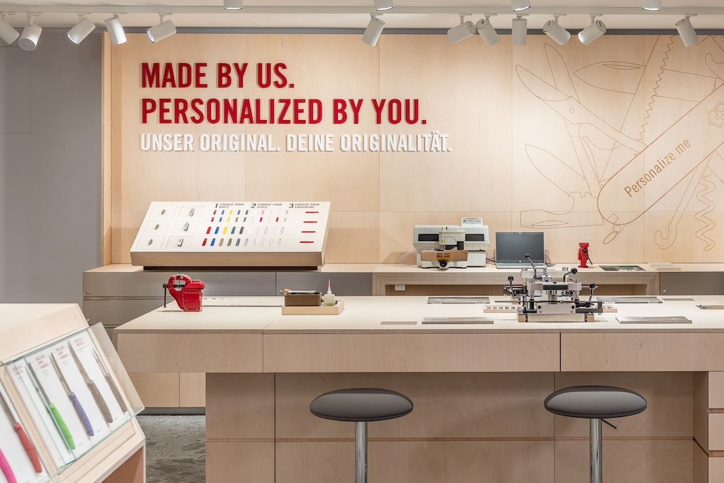 La personalización es una característica clave del nuevo concepto de comercio minorista. Las estaciones personalizadas permiten a los clientes ensamblar y grabar su propia navaja suiza, respaldadas por pautas de diseño estilo taller e ilustraciones artísticas que hacen un guiño a la herencia artesanal de Victorinox.