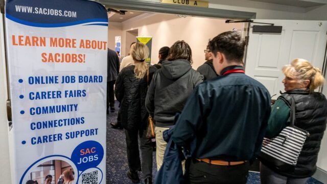 Los solicitantes de empleo esperan para asistir al evento SacJobs Career en Sacramento, California, EE. UU., el jueves 13 de noviembre de 2025.