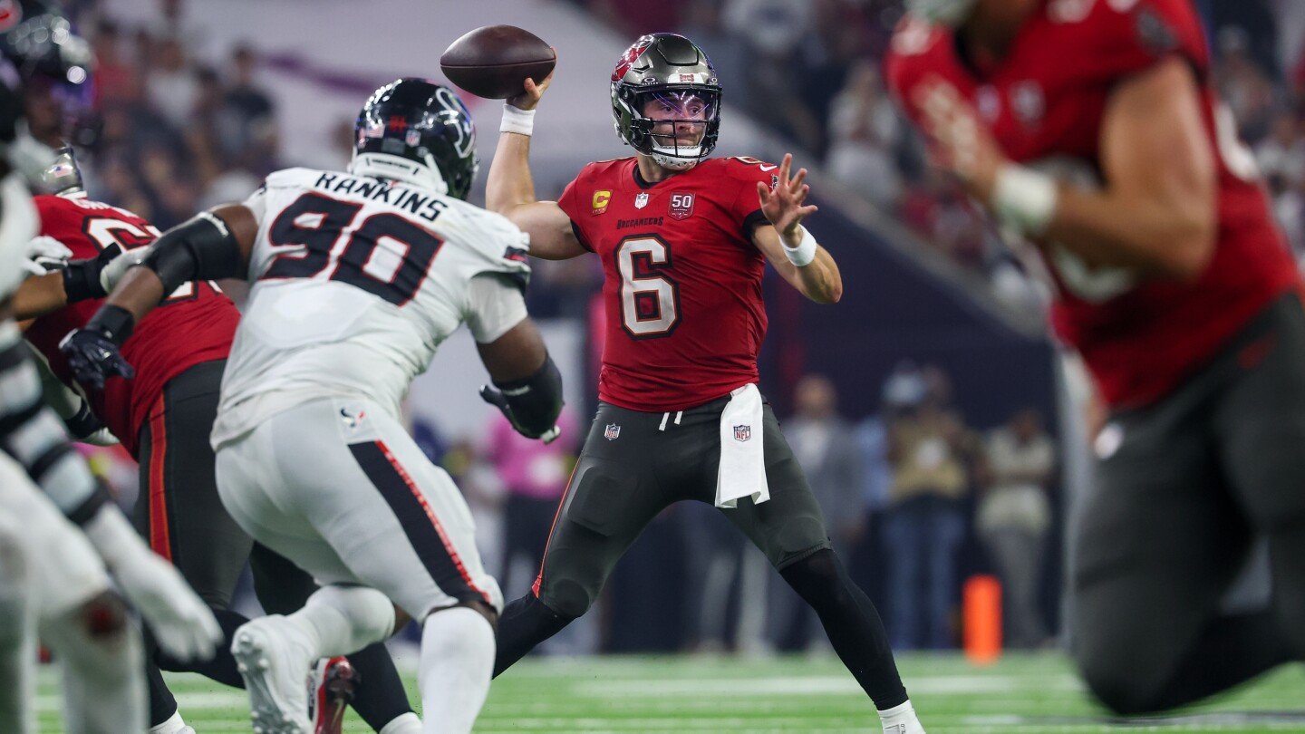 Detrás de una línea ofensiva plagada de lesiones, el mariscal de campo de los Buccaneers, Baker Mayfield, llevó a su equipo a una victoria de regreso de último minuto sobre los Texans el lunes por la noche, y luego elogió a los respaldos que lo protegían.