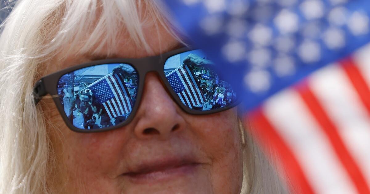 Jacob Moreno, un profesor de inglés de Rialto, tenía una señal que llamó al día un “funeral por la libertad que pretendemos” todavía existe. Dijo que el estado de ánimo se sintió más solemne que la manifestación de “no reyes” el mes pasado, que atribuyó a la aprobación del proyecto de ley de presupuesto de Trump. El llamado “Big Beautiful Bill” agrega bruscamente $ 150 mil millones para llevar a cabo deportaciones masivas y la aplicación fronteriza de fondos.