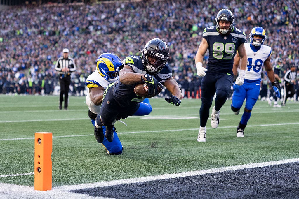 Kenneth Walker III lit up the Rams in the NFC Championship Game for 111 total yards and this touchdown. (Photo by Michael Owens/Getty Images)