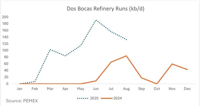 Pero la realidad de la operación de refinería de petróleo más grande de México es un camino lleno de baches. A pesar de la capacidad de exportar gasolina a 170,000 b/d (cuando ambos trabajan CDU), las instalaciones nunca han estado cerca de ese nivel. La producción más alta en junio de 2025, con un precio de menos de 79,000 b/d, antes de disminuir hasta 41,000 b/d en agosto, casi menos de un cuatro de la producción de gasolina (ver el gráfico). La refinería luchó repetidamente la interrupción a fines de 2073. En abril de 2025, las anormalidades durante el ajuste del balance eléctrico causaron la falla del dispositivo que lleva más de una semana comenzar la operación. En agosto, las fuertes lluvias conducen a la parada de energía que se apaga. Importante durante varias semanas, obligando a PEMEX a desviarse de tres barcos de aceite al distorial maya en Texas.