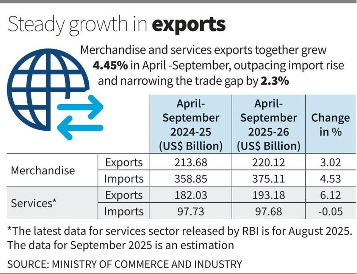 Al considerar la primera mitad del año financiero, los datos muestran que las exportaciones totales aumentaron un 4,45% en el período abril-septiembre de 2025 a 413,3 mil millones de dólares. Las importaciones totales aumentaron algo más lentamente, un 3,55%, hasta 472.800 millones de dólares durante el mismo período. Como resultado, el déficit comercial en el primer semestre del ejercicio disminuyó un 2,3%.