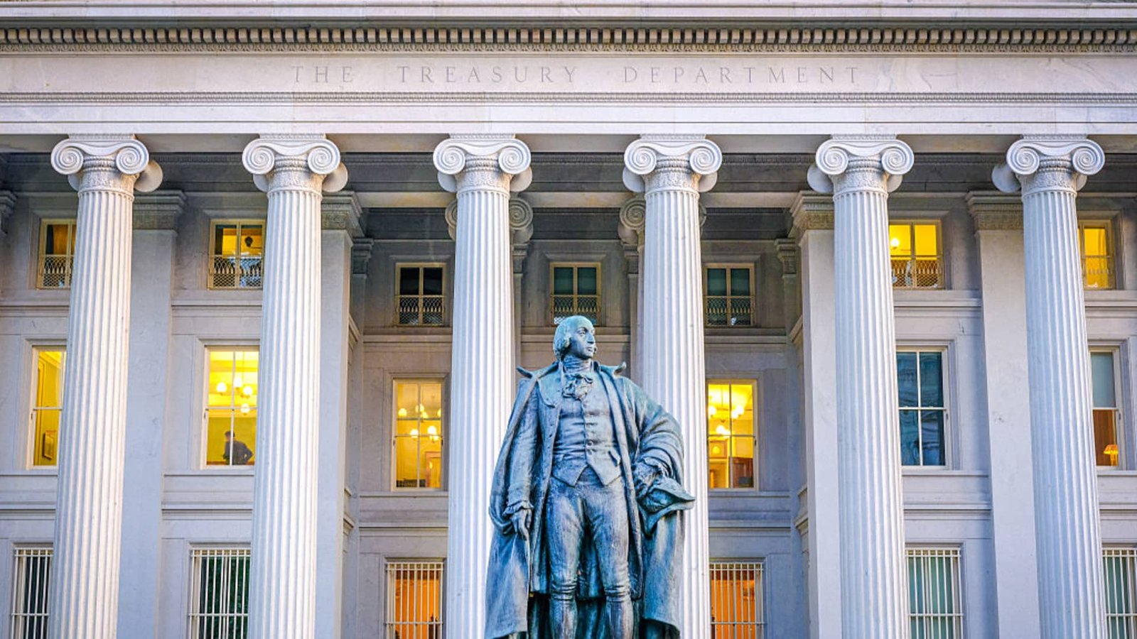Una estatua del exsecretario del Tesoro, Albert Gallatin, se encuentra frente al ala norte del edificio de la sede del Departamento del Tesoro de Estados Unidos el 24 de abril de 2025 en Washington, D.C., Estados Unidos.