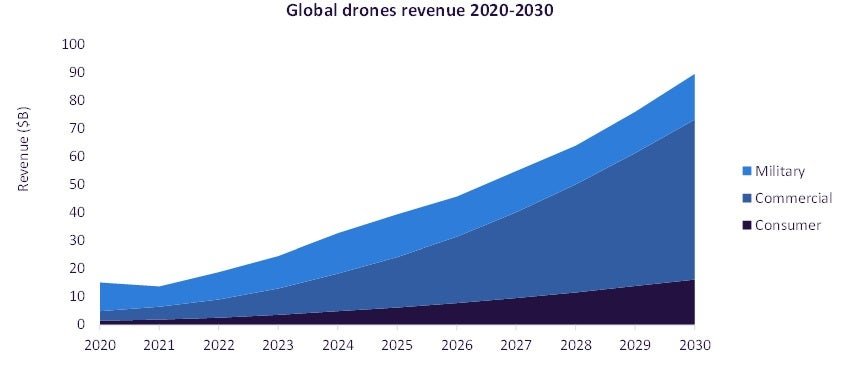 Según las principales empresas de información y análisis orbeLas predicciones de los mercados de murmullos en todo el mundo aumentarán de $ 32.2 mil millones en 2024 a casi 90 mil millones de dólares estadounidenses en 1970, con drones comerciales superando a los drones militares como el grupo más grande en 2025. Los petróleo y el gas son una de las industrias importantes que impulsan esta expansión. Este rápido crecimiento del mercado refuerza que el dron ya no es una herramienta específica.