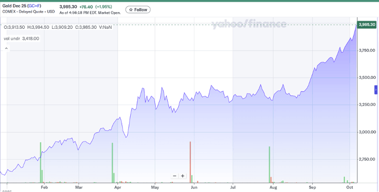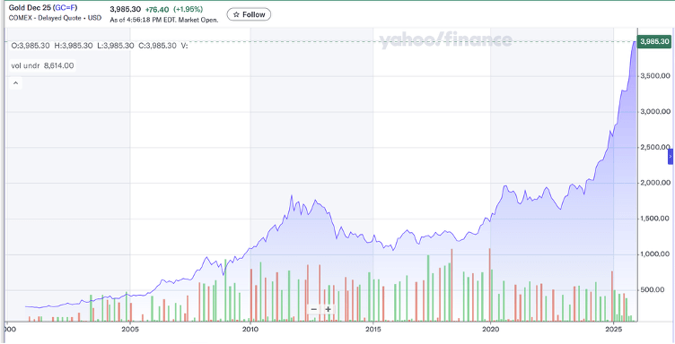 Veamos el oro ahora. Cerró ayer con $ 3,984 por onza, un aumento de $ 1,330 desde el comienzo de 2025. Este es un gráfico: