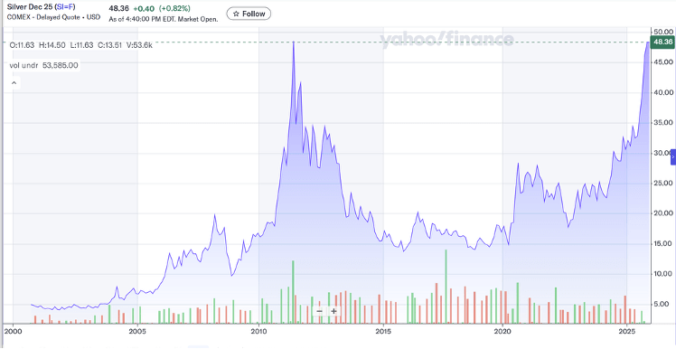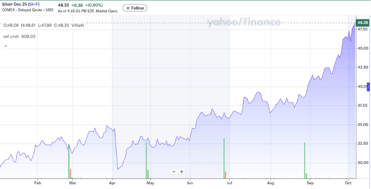 Comience con el dinero cerrado ayer. (Lunes 6 de octubre) a $ 48.38 por onza, un aumento de $ 19.00 desde el comienzo de 2025. Este es un gráfico: