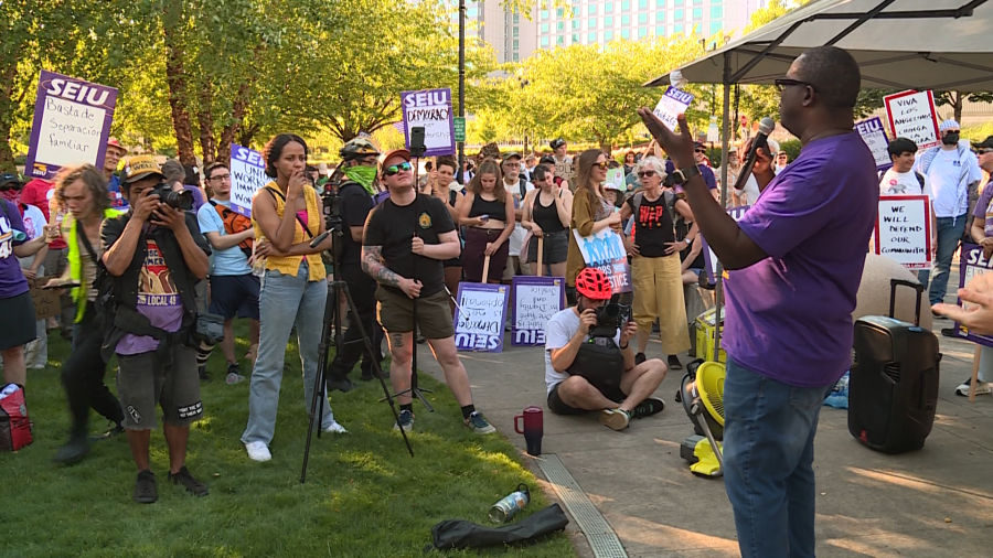 “Estamos aquí para defender los derechos de todos para su Primera Enmienda, para poder protestar y hablar en contra de esta administración”, dijo Johnny Earl, presidente de SEIU 503 local, en la protesta del lunes.